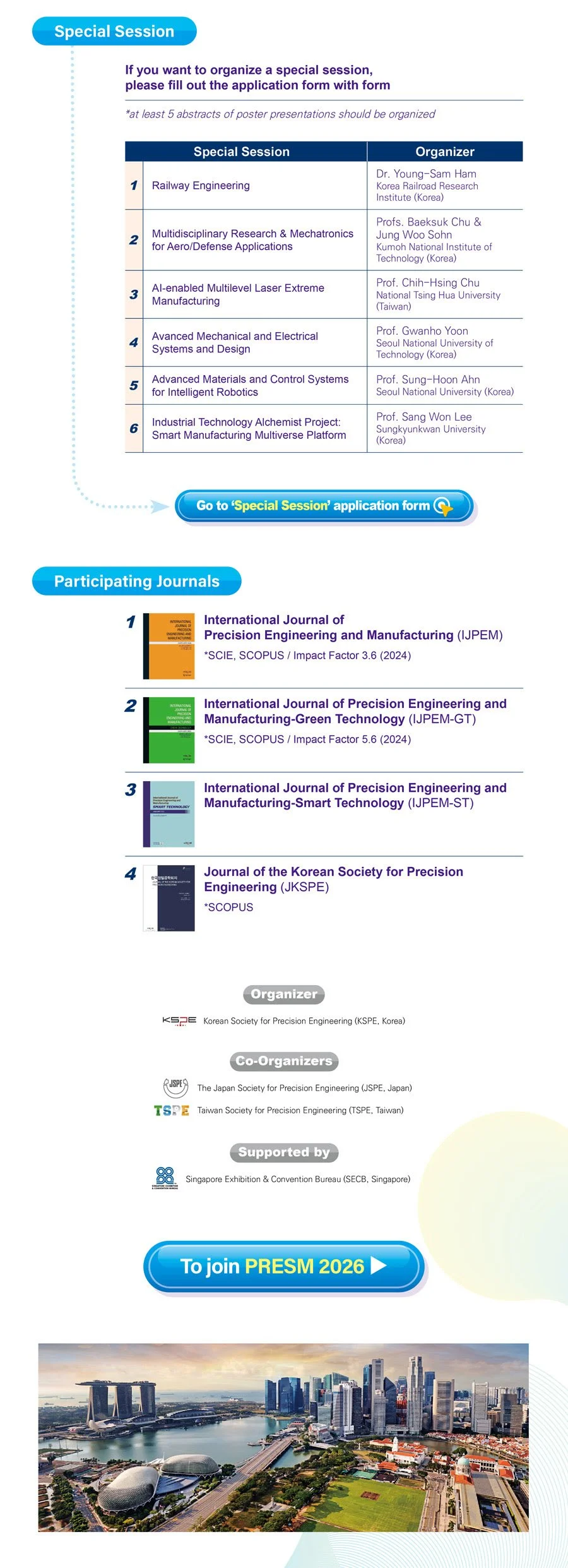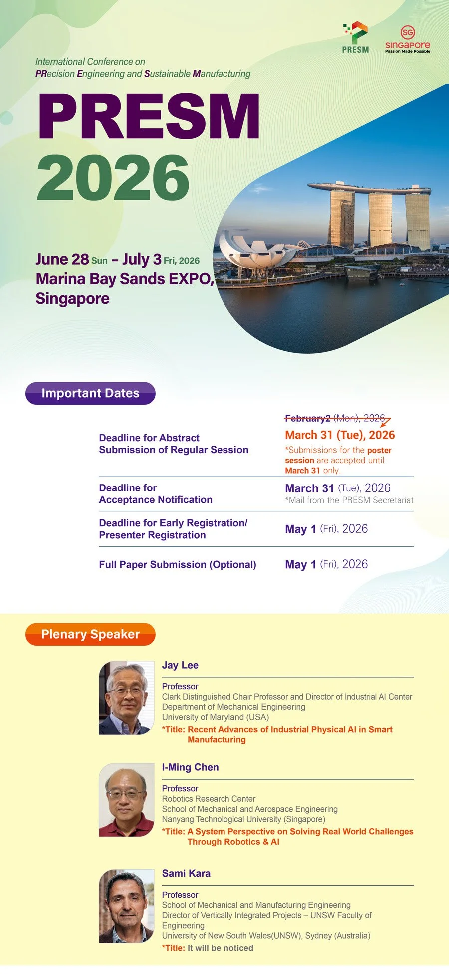Prof. Lee has been invited to serve as a plenary speaker at PRESM, June 28(Sun) - July 3(Fri), 2026 / Marina Bay Sands EXPO, Singapore. He will delievered a speech titled “Recent Advances of Industrial Physical AI in Smart Manufacturing“.